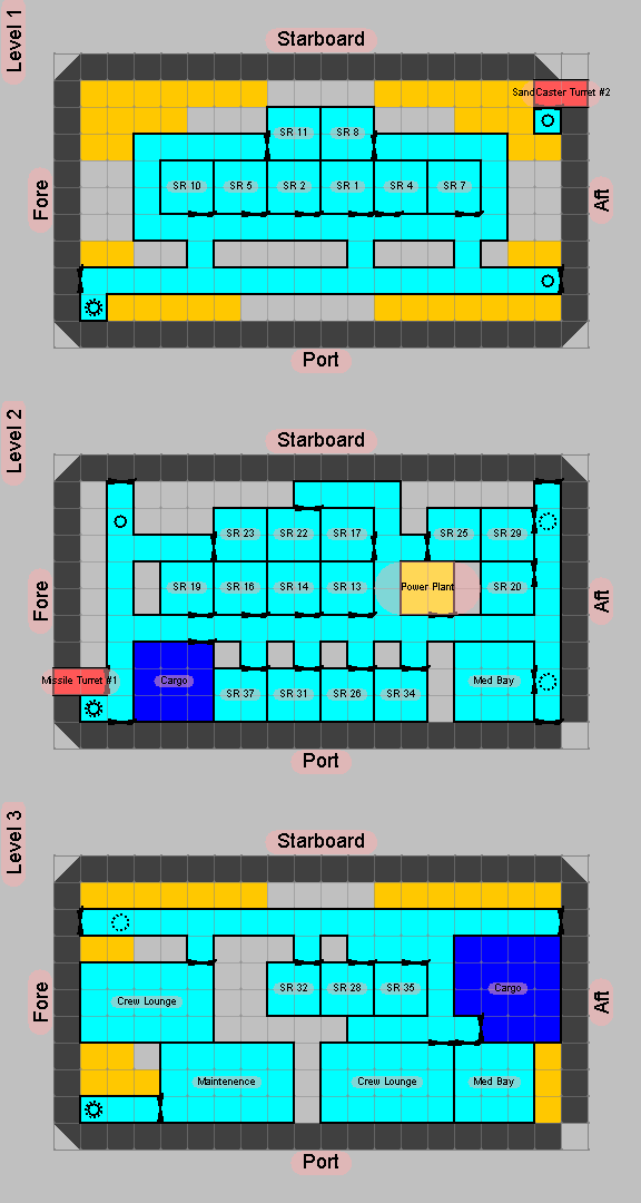 | Accom: | Crew=24 (1 bridge, 1 engineer, 1 gunner, 6 flight, 12 troops, 3 command), Staterooms=24, Env=basic env, basic ls, extended ls |