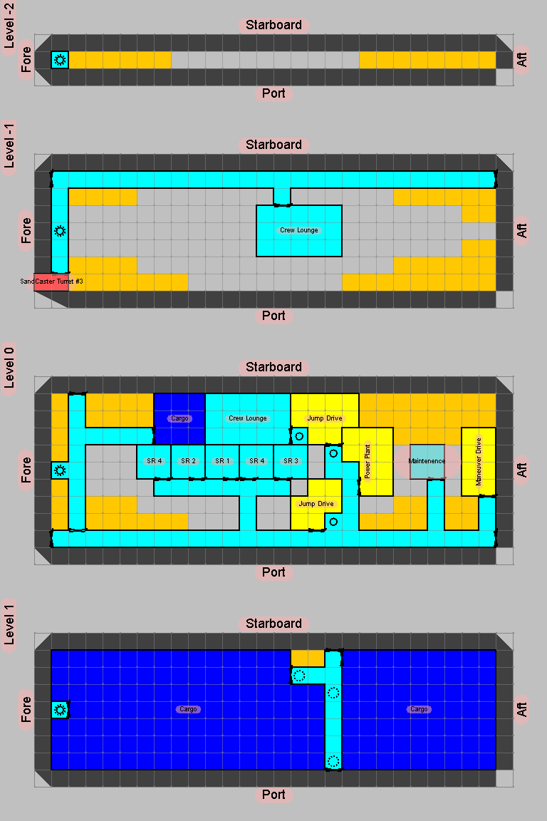 | Accom: | Crew=3 (1 bridge, 1 engineer, 1 gunner), MidPassengers=2, Staterooms=5, Env=basic env, basic ls, extended ls, grav plates, inertial comp |