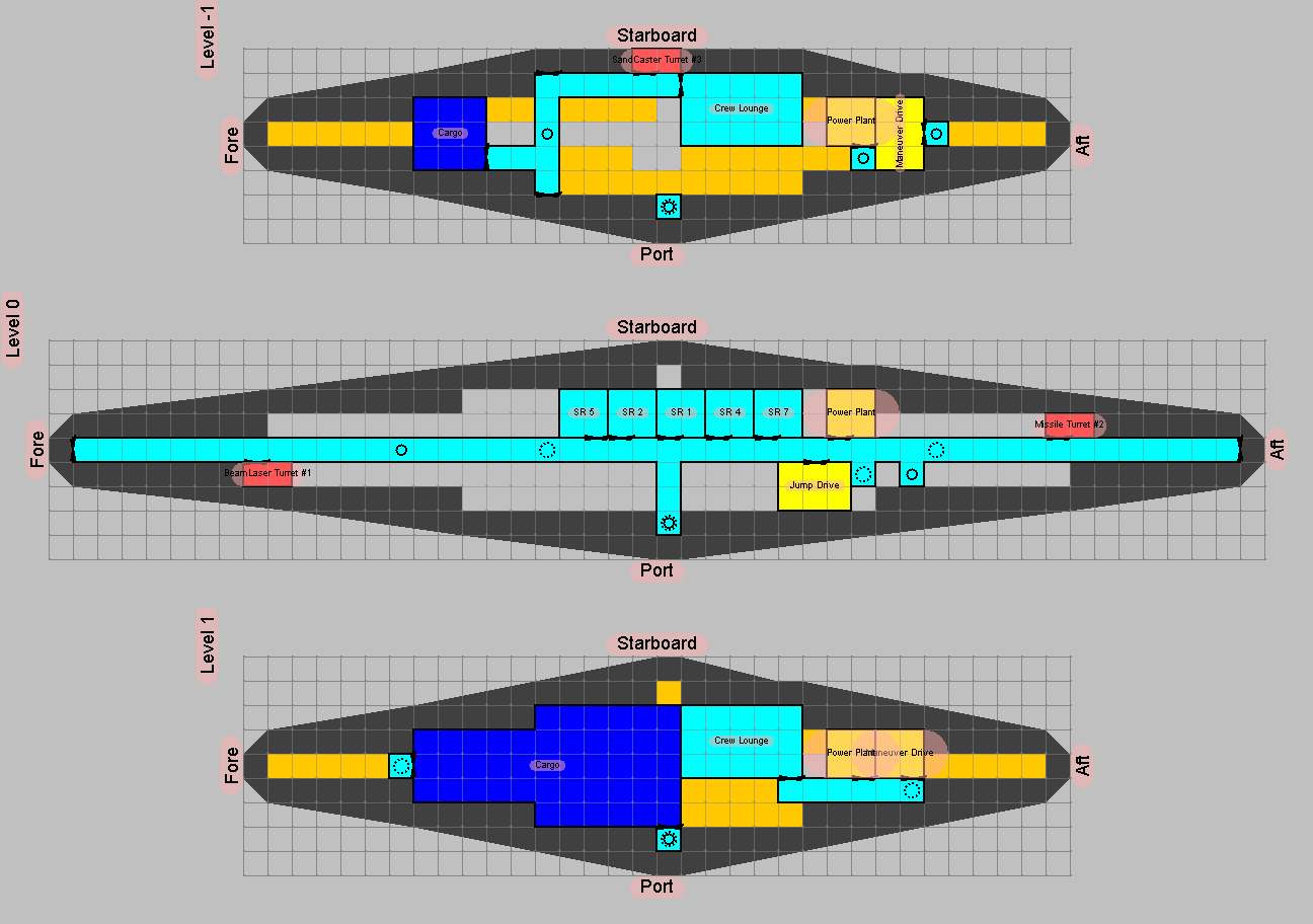 | Accom: | Crew=2 (1 bridge/engineer, 1 gunner), Passengers=6, Staterooms=4, Env=basic env, basic ls, extended ls, grav plates, inertial comp |